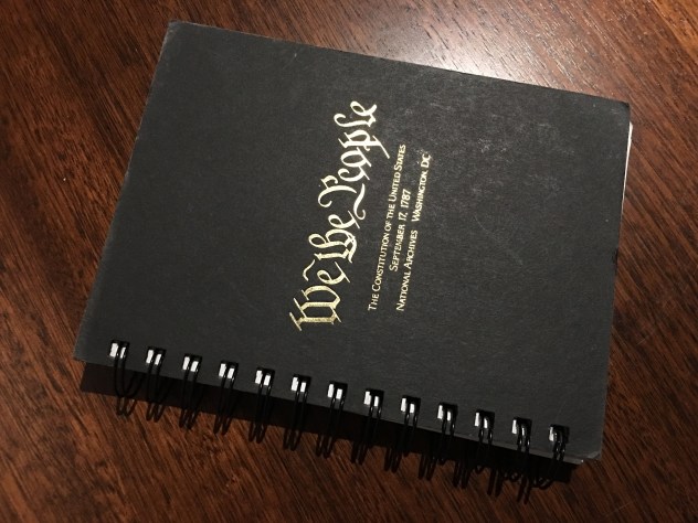 The black notebook had embossed gold wording “We the People” with “The Constitution of the United States, September 17, 1787. National Archives, Washington DC.”