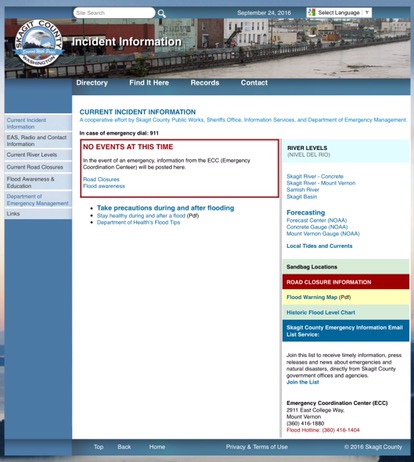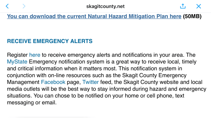 - Website: Skagit County Department of Emergency Management has a website with a page for “Current Emergency Incidents.” The page currently has and for the duration of the emergency, shown “No events at this time.”