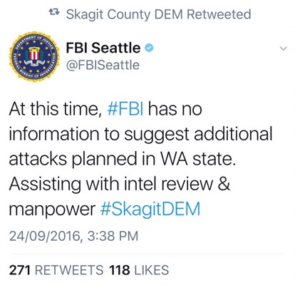 Skagit County Department of Emergency Management (SCDEM) is distributing information about the incident on Twitter at @SkagitDEM using hashtag #CascadeMallShooting. Washington State Patrol Public Information Office (PIO) Sgt Mark Francis is also tweeting at the scene as @wspd7pio.
