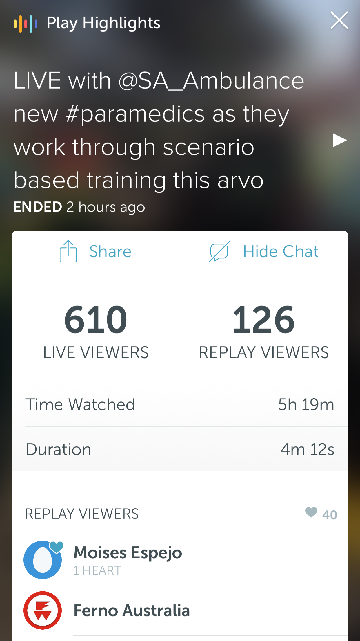 Periscope is akin to arch social media rival’s Facebook Live. There are statistics all users can see, for example this Periscope screen shot shows: