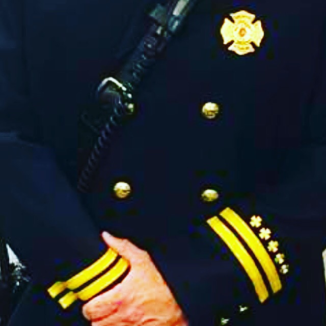 Don’t let the Chief’s uniform (shown), badge, stars and stripes fool you: First responders have to be tough and strong and compassionate at an incident. They serve and protect, run to the danger not from it.