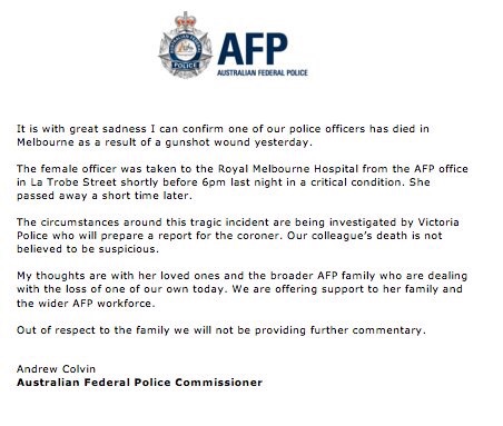 At approximately 5:45pm on Monday, February 6th, 2017, the Officer was wounded in a shooting incident at the AFP Headquaters in La Trobe Street, Melbourne and was transported to the Royal Melbourne Hospital.